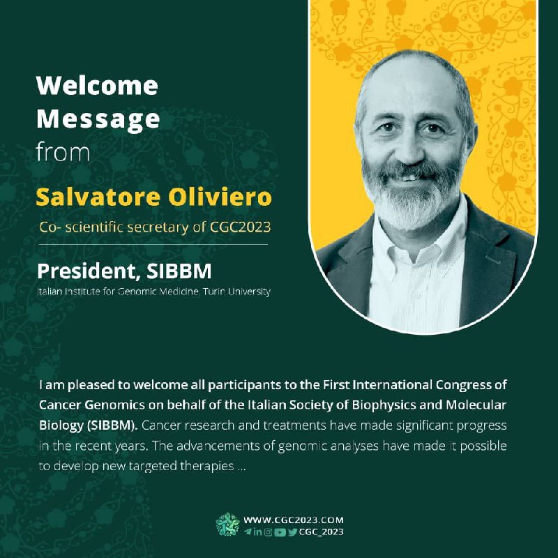 ” I am pleased to welcome all participants to the First International Congress of Cancer Genomics on behalf of the Italian Society of Biophysics and Molecular Biology (SIBBM).